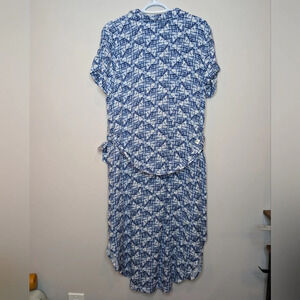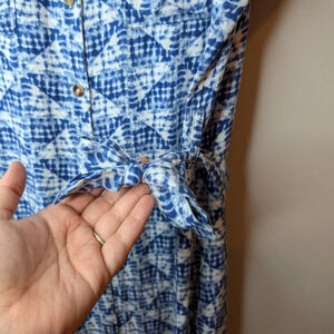 This size Large dress features a timeless blue and white colour scheme, a flattering button-front closure, and a cinching tie waist for a defined silhouette.