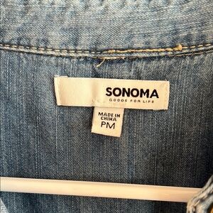 Casual denim dress with short sleeves and button-up front. Features front pockets and a drawstring waist. Excellent condition, comfortable and cute. Size PM.