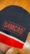 Black beanie with red and white accents featuring SAMCRO logo from Sons of Anarchy.