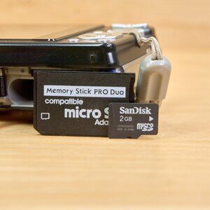 Comes with a battery, charger, 2GB Micro SD, and Memory Stick Pro Duo adapter