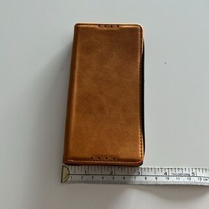 Brown faux leather folding case with card slots, firm magnetic close. Bend case at its' natural crease to stand up horizontally and view phone screen hands free.