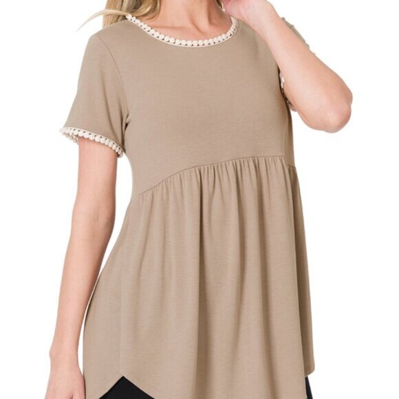 SHORT SLEEVE EMPIRE WAIST SHIRRING TOP WITH POMPOM TRIM