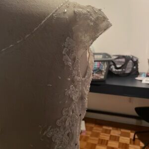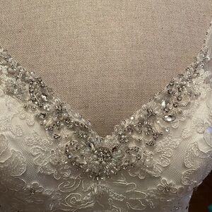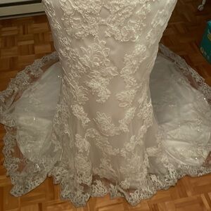 Stunning lace wedding dress by Sophia Tolli. Features intricate lace detailing. Elegant mermaid silhouette. Perfect for a timeless bridal look.