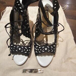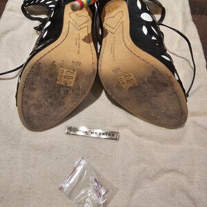 This Sophia Webster sandal with doily-cutout patent leather upper has a 3″ multicolor beaded heel, self-tie lace-up vamp, adjustable ankle strap and leather lining and sole.