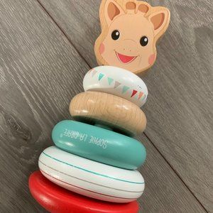 A Sophie themed variation on a classic toy! This sturdy, wooden, stacker toy features six chunky, stackable pieces topped off by the familiar smiling face of Sophie the Giraffe. Great for developing manual dexterity, little ones will have lots of fun putting the colourful segments on to the spindle. Once complete this stacker also has a charming little wobble!