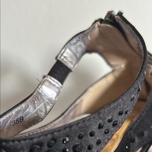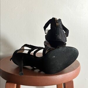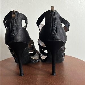 These black heels feature a sleek stiletto heel and an intricate strappy design that extends from the toe to the ankle. The peep-toe style and shiny finish add a touch of elegance, making them perfect for formal occasions. A convenient back zipper ensures a secure fit, while the 4-5 inch heel height offers a flattering lift.