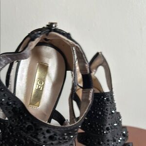 These black heels feature a sleek stiletto heel and an intricate strappy design that extends from the toe to the ankle. The peep-toe style and shiny finish add a touch of elegance, making them perfect for formal occasions. A convenient back zipper ensures a secure fit, while the 4-5 inch heel height offers a flattering lift.