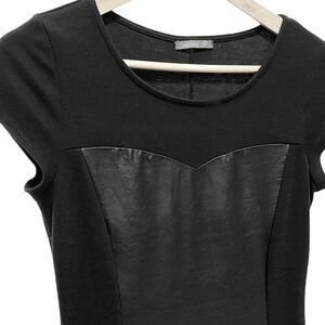 Loved this dress! SUPER flattering cut, SUPER comfy wear all day stretchy fabric, and cool front faux leather panel. Open neck and cap sleeves just seal the deal. Hits above the knee on a 5'6" frame.