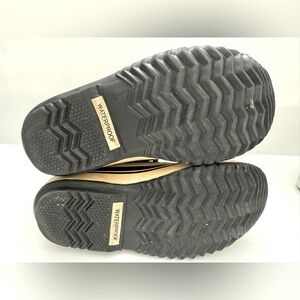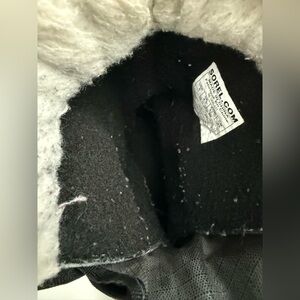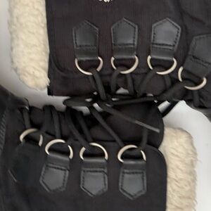 Sorel boots with black exterior and cream accents. Insulated for warmth.