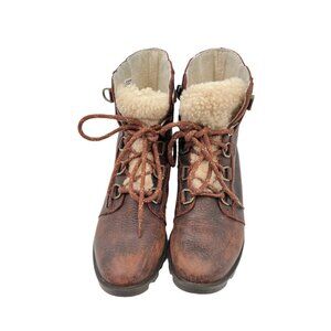 Brand: Sorel | waterproof leather upper, fleece liner, sherpa trims, Good pre-owned condition, normal marks of wear.
