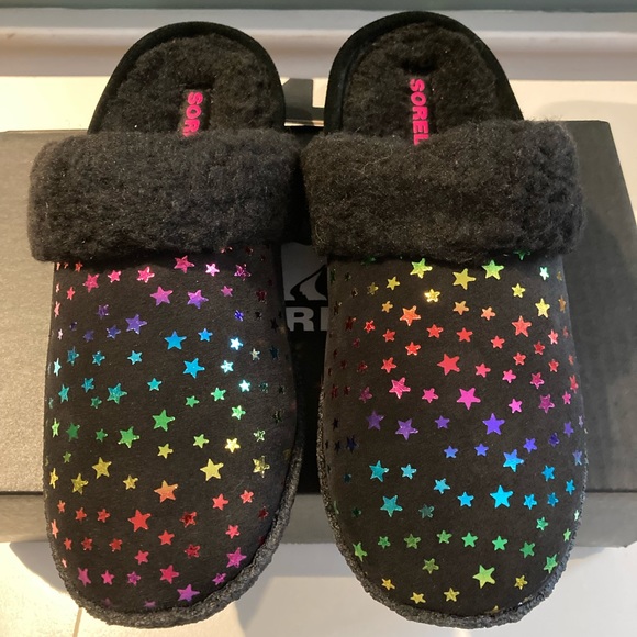 Sorel slide slippers. Indoor or outdoor wear. Suede with glitter star pattern and fleece lining. These are new/never worn. These are youth 6 which is a 38. I am an 8 and they were too small and why listed as 7