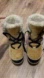 There is a small dark spot on the front of one of the boots, and the fur lining is worn down in both from use. The boot is still very warm and keeps feet warm and dry during the cold winter days.