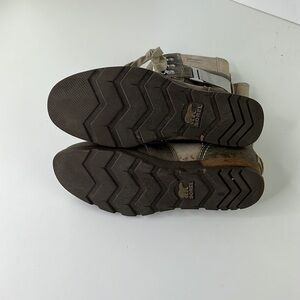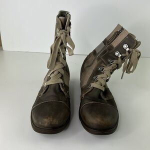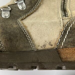 Military style boot. Made with canvas and leather. Lace up and has side zipper.