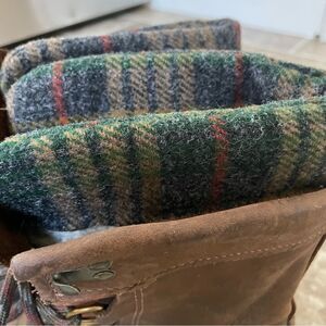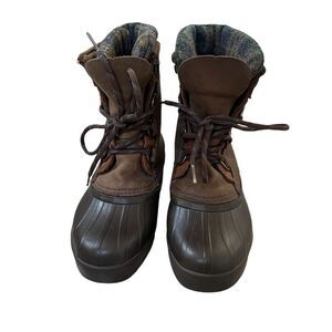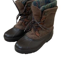Sorel sturdy and stylish winter boots. Brown leather with a cozy plaid inner lining, front laces. Liner is removable. Perfect for cold weather.in very good pre-owned condition, some