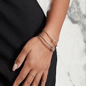 • Sleek cable design • Adorned with micro crystals • Buy multiple to stack together • Mixed metals of gold and silver • Adjust to fit • 2.5” in diameter