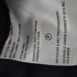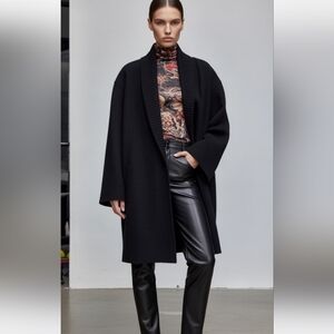 Black wooly coat with a ribbed collar. It has a one snap closure and side pockets. The front corner hangs a little lower. It's a cozy chocolate that feels like you're wearing a heavier sweater. Pit to pit is approximately 24" and length is 37". Gently worn.