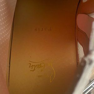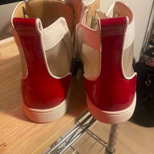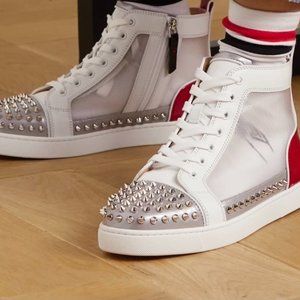 Christian Louboutin's sneakers come with striped socks that peak out from over the high-top cuffs and are visible through the perforated mesh side panels - you can also wear them solo. This pair has been made in Italy from leather and has glossy red patent heel tabs and zipped sides, so you don't have to fuss with the laces. The spikes on the toes are a brand signature. Worn once.