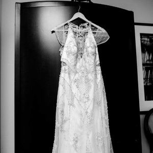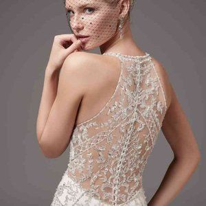 Shimmering beaded lace appliques and crosshatching add luster and dimension to this glamorous wedding dress, highlighting the waistline, illusion halter over V-neck, and illusion open back. Embellished lace hem completes the sheath gown's striking lines. Finished with crystal buttons over half zipper closure.