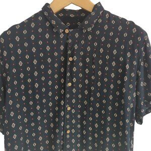 This is a navy blue and white print short sleeve button down shirt by ASOS brand Soulstar England.