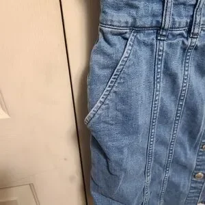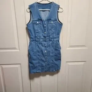Stylish mini dress with button-front design. Features sleeveless cut and front pockets. Perfect for casual wear.
