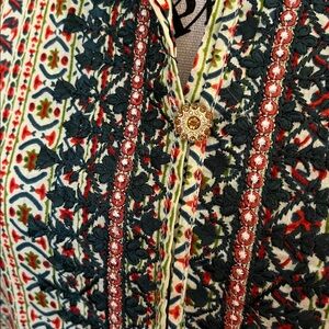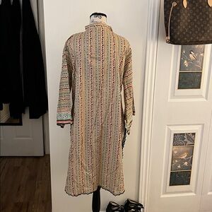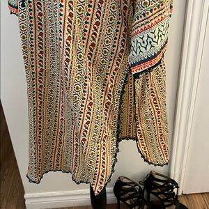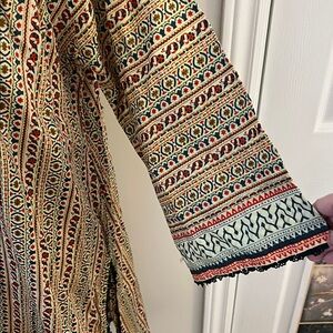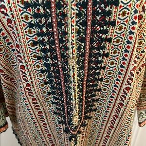 Stylish tunic with intricate patterns. Features a mix of colors. Perfect for swimsuit, cover or casual wear; pit to pit 24 inches; length 37 inches; shoulder to shoulder 16 inches; perfect as a beach cover; slits up the side; material is very nice quality , feels like cotton; tag says size large, but please go by measurements 🤗
