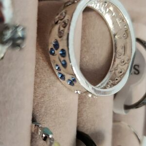 Vibrant collection of women's rings. Features multicolor, silver, gold, and green accents. Unique designs for every style.