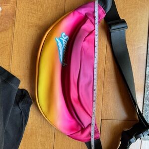 Vibrant crossbody bag with a gradient design. Features a secure black strap. Perfect for casual outings.
