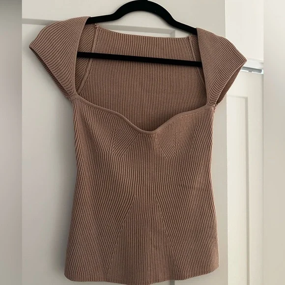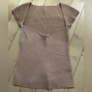 Stylish ribbed knit top. Features cap sleeves and sweetheart neckline. Perfect for casual wear. Colour is a muted dusty pink. The size is O/S but fits like a small.
