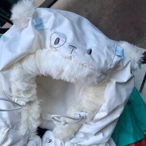 Design: White with embroidered “Chat polaire” (Polar Cat) and playful details, including ears on the hood.