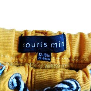 Blue stretchy shorts resembling denim from Souris Mini. They feature a yellow elasticated waistband with striped drawstrings for an adjustable fit, two front pockets, faux stitched back pocket and a Souris Mini patch on the back waistband. The shorts are in very good condition.