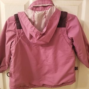 Used child's jacket from a Non-smoking/ no pets home. Left sleeve has a 1mm pinhole that's not noticeable. Still lots of use left in this. Light burgundy color. Size 2. Hood tucks in behind collar; converts to a vest or body warmer by removable zipper sleeves.