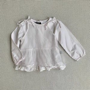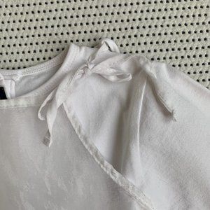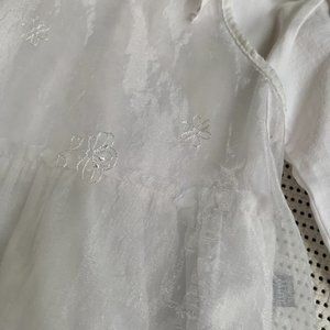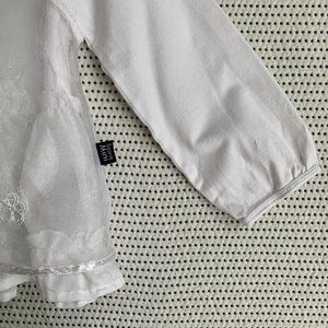White cotton long sleeved shirt with an embroidered, gauzy, detachable overlayer that ties in place at the shoulder. The under layer features 3-button closure at the neckline, loops to tie in the gauze topper, and a bit of a peplum detail at the bottom for volume.