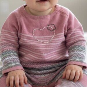 A lightweight pink striped knit jumpsuit by Souris Mini features an embroidered heart design on the chest and has button closures along the inseam and at the back. The jumpsuit is in very good condition.