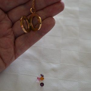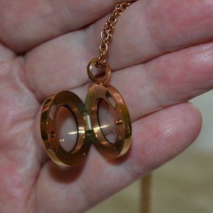 Stunning South Hill Designs rose-gold tone locket with crystals surrounding round face & plain back, opens to reveal 4 Swarovski crystals (2 purple, 1 pink & 1 amber). Locket measures approx 3/4" in diameter x 2/8"W. Chain measures 19" & is adjustable. Excellent condition, worn once.
