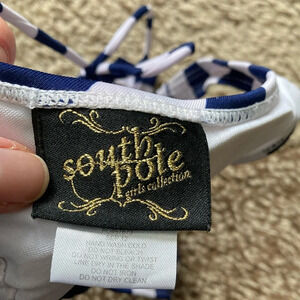 Stylish halter bikini top. Features bold blue and white stripes. Perfect for beach days.