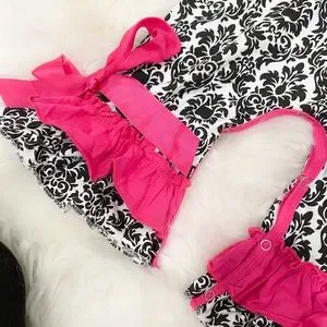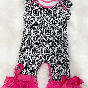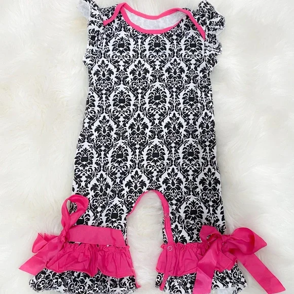 Southern Demask Ruffle Romper with Ribbon Accents