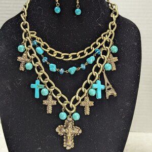 Southwestern Aqua Turquoise Goldtone Cross Pendants Statement Necklace