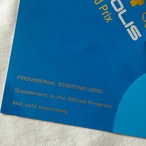 Great addition to your F1 collection. The official race program in a zippered case from the Indianapolis Motor Speedway. The provisional line up card (post qualifying session) is included as well showing the racers in their grid position. Rubens Barrichello took poll that weekend setting a new track record. Michael Schumacher took the win but due to some serious crashes, only eight cars finished with Minardi's only point.