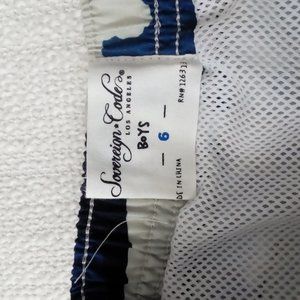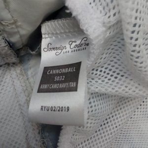 Sovereign Code Cannonball Board Shorts (Toddler & Little Boys) Style #S032KL Color Army Camo Navy Size 6 Details - Elastic waist with tacked drawstring closure - Side foldover flap pocket with snap button closure - Back slip pocket with hook-and-loop closure - Allover print - Mesh lining