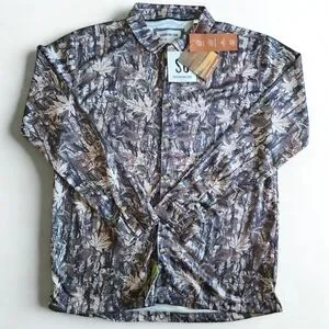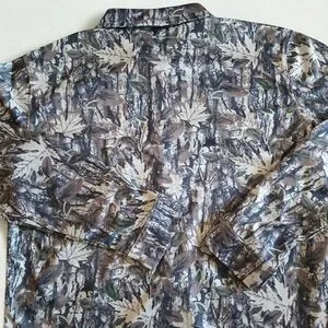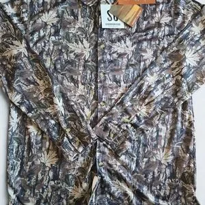Short-sleeve shirt with a forest-inspired design. Features button-up front and natural tones.
