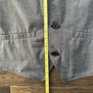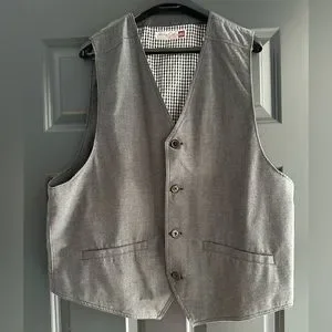 Stylish gray vest by Sovereign Code. Features button closure and two front pockets. Perfect for layering.
