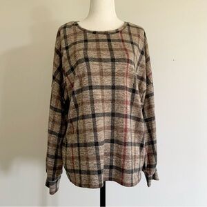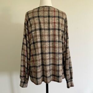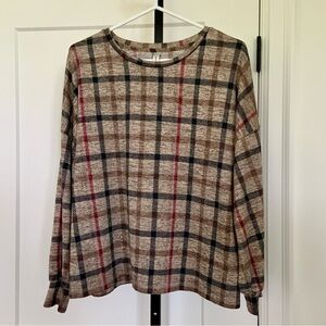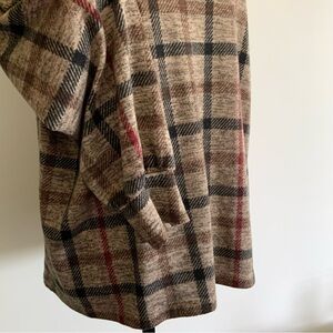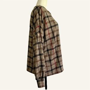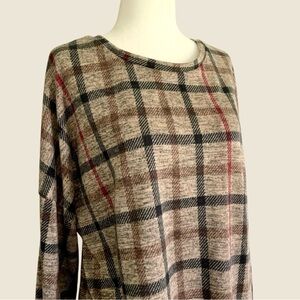 Marled tan background with black, brown and red plaid pattern. Very soft fabric; blend of viscose, polyester and elastane.