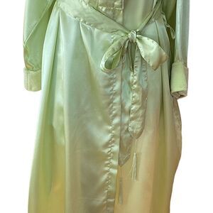 Green, polyester, belt with tassels, pockets on side, velour collar and cuffs, long sleeves, mid calf, EUC, neck to hem approximately 47”, armpit to armpit across back 28”, armpit to cuff 17”.