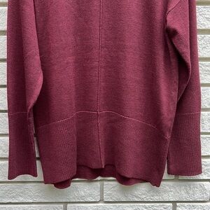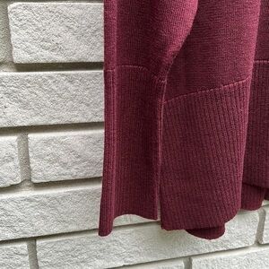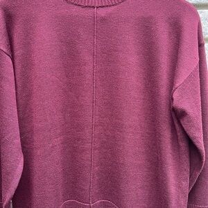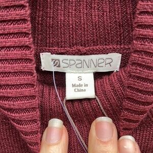 New with tags burgundy/wine coloured Spanner sweater. Knit with mock neck and wide cuffs at bottom of arms and sweater. Seam runs down front at centreline. Lovely, soft material, looser fitting, hangs straight.