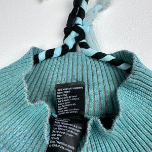 A fitted mock neck long sleeve sweater with vertical rib of contrasting heather grey and aqua blue.