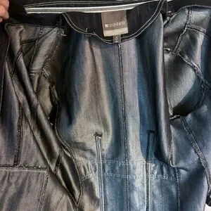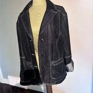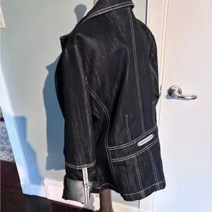 Elevated jean jacket with lots of detail. Trim at back. Fitted at waist. Wear sleeves up or down. Zippered pockets at front.