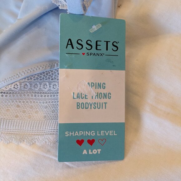Spanx. Size M. Baby blue colour. New with tags. Materials: nylon, elastene and lace trim. Shaping Level (2 out of 3 hearts) Pretty lace neckline - wear to be seen or underneath your look. Adjustable, convertible straps for many ways to wear. Soft, feminine, sexy.