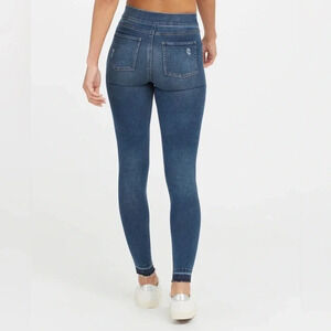 Spanx Distressed Ankle Skinny Jeans Medium Wash. Designed with comfortable stretch denim, high-rise coverage and hidden tummy shaping, this Distressed Skinny Jean is a “jean come true.” It’s the perfect match for your tees, sweaters, tanks and everything in between. Pull on design, mock front pockets and functional back pockets. Size extra small. Excellent condition.