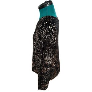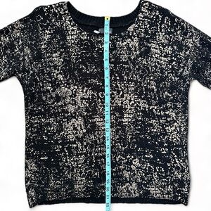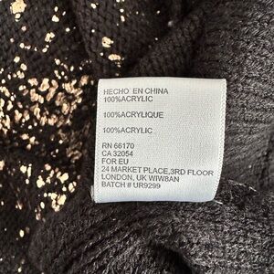 This is a beautiful, size medium, black knitted sweater made by Sparkle and Fade and has a gold fleck all over it. It’s almost like it’s been sprayed with gold paint. Really cool design. Take a look at the close-up photos to get an idea of the design. It’s really soft all over. 100% acrylic. Please see the measurements in the photos.