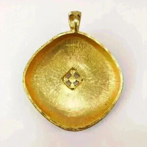 This is a large vintage statement pendant. The pendant features a blue enameled base with sparkle star and two crescent moons in rhinestones, with enameled tiny circles that form a flower cross in the middle. The center circle is red with two green and two burgundies on the sides. A gorgeous statement piece on gold-tone metal.